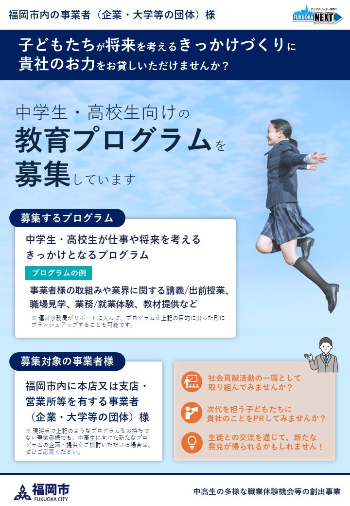 福岡市内に本店又は支店・営業所等を有する事業者(企業・大学等の団体)様を対象に、中学生・高校生向けの教育プログラムの第1次募集を行っております。提供いただいた教育プログラムは、8月中旬頃までに特設ウェブサイトに掲載予定です。