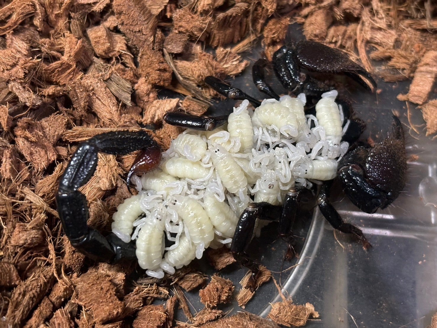 世界最大級に達するサソリの1種。白い生体を見れるのは生まれたてだけです。