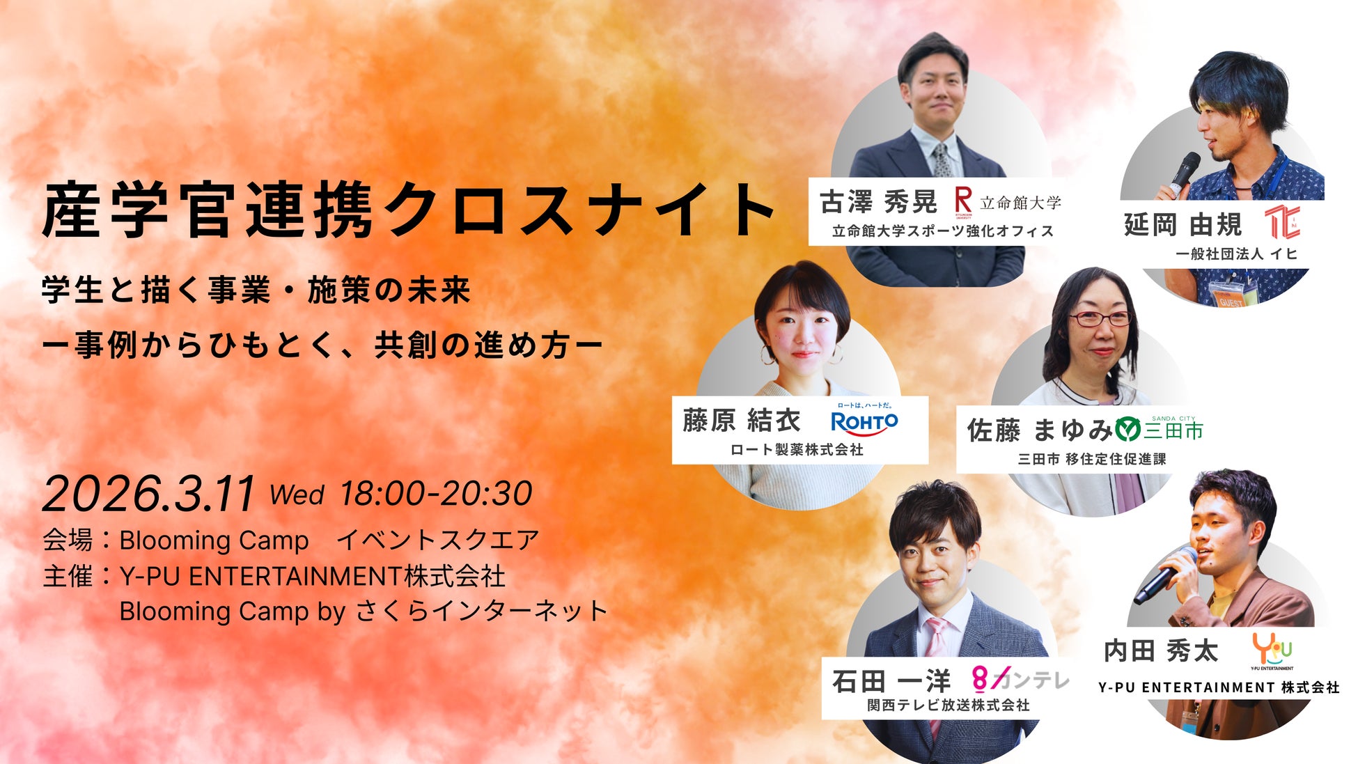 Y-PU ENTERTAINMENT株式会社(本社:大阪府大阪市、代表取締役:山本浩彰)は、さくらインターネットが運営するオープンイノベーションのための施設「Blooming Camp」にて、産学官連携クロスナイトを開催します。