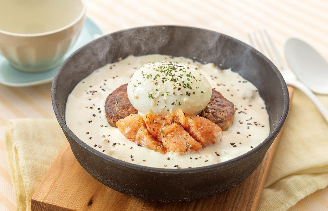 ハンバーグの上に半熟卵を乗せ、熟成明太子をトッピング。濃厚なチーズソースにも熟成明太子が入っております。