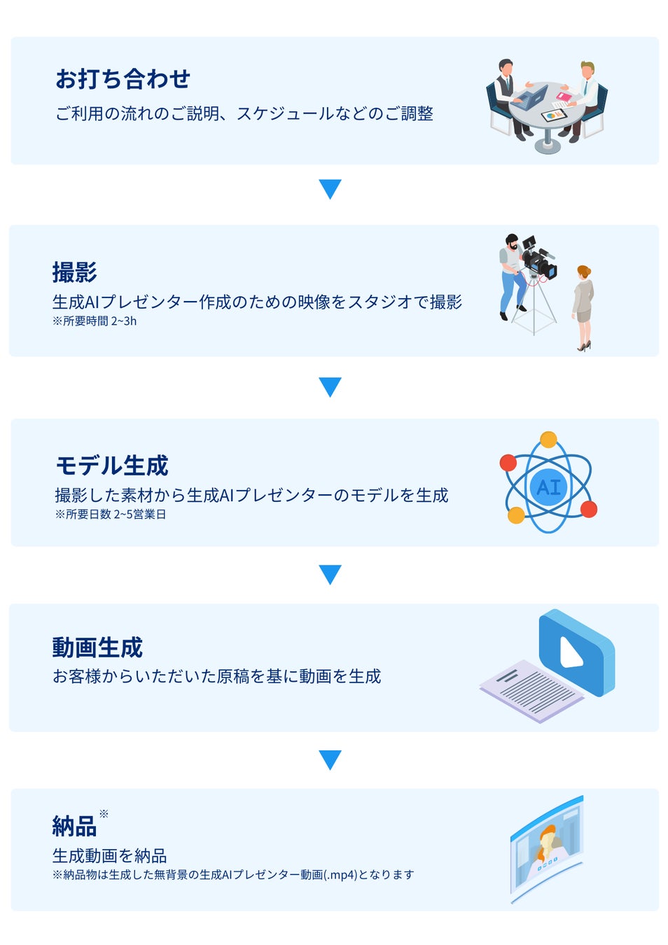 生成AIプレゼンターは、生成AIを活用し、リアルなモデルを作成します。そのモデルを用いて、本人に代わってプレゼンテーションなどを行う動画を提供するサービスです。
