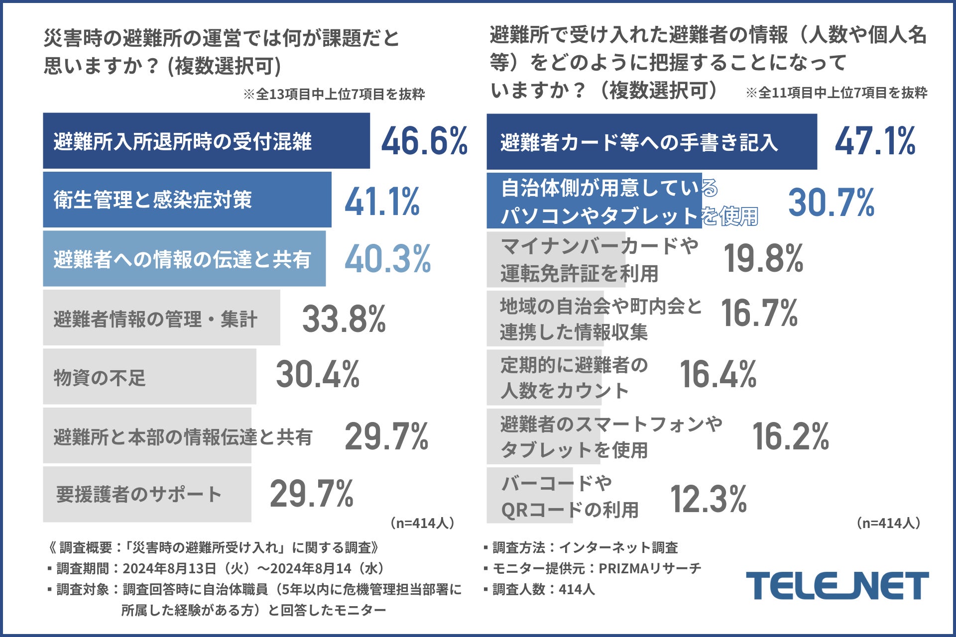 今回、「災害時の避難所受け入れ」に関する調査をしたテレネット株式会社(https://telenet.co.jp/emergeo/)は、自治体向け避難者名簿デジタル管理システム「らくらく避難所くん」(https://telenet.co.jp/rakurakuhinan/)を提供しています。
