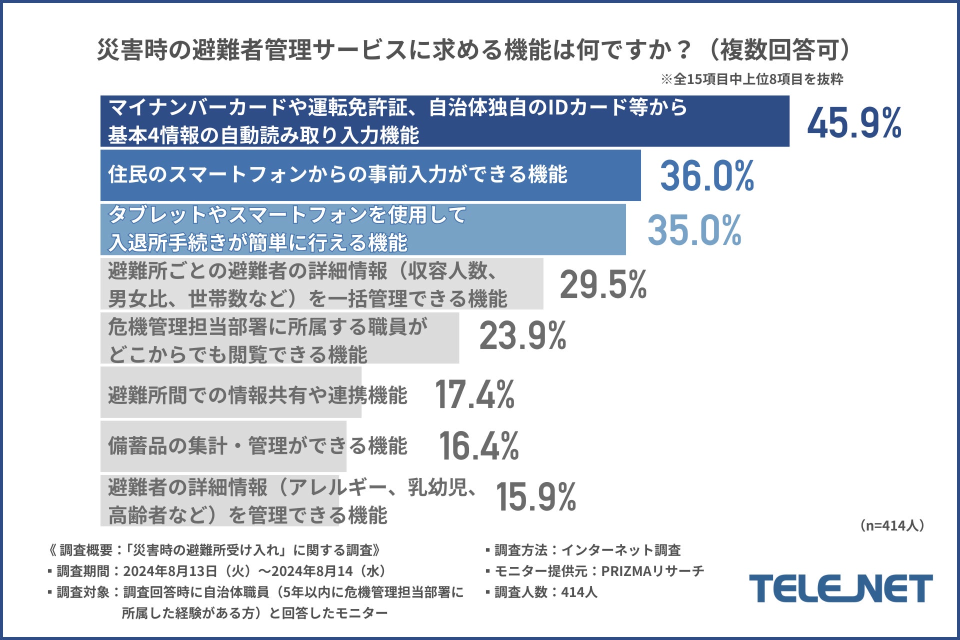 避難者管理サービスに求められる機能としては、マイナンバーカードや運転免許証、自治体独自のIDカード等から基本4情報を自動読み取り入力ができるものと回答した方が約半数となりました。