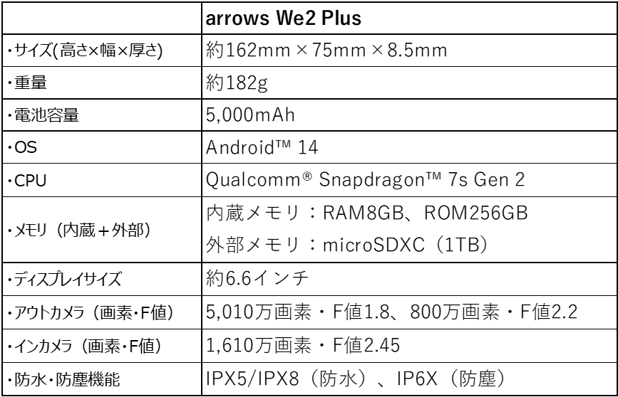 これまで培ってきた「防水・防塵※3」「耐久性※4」「環境配慮」といった独自の強みは受け継ぎながら、「arrows We2 Plus」は、より多くのお客さまにご満足いただける、コストと機能のバランスのとれた快適なスマートフォンです。