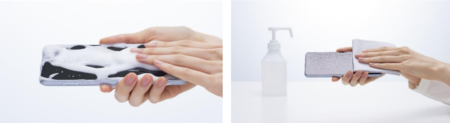 国内メーカー製の家庭用泡タイプのハンドソープあるいは国内メーカー製の家庭用液体タイプの台所用洗剤を使って洗えます(FCNT合同会社試験方法による)。無故障を保証するものではありません。ついた泡は水道水でしっかりすすいでください。濡れた状態では、充電しないでください。洗い方の詳細については「FCNT合同会社のWebサイト」でご確認ください。