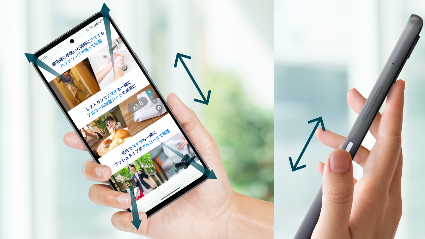 そして電源キーで指紋と指の動きを読み取る「Exlider」機能を搭載しました。復活※7を望むarrowsご利用者様の声に応えました。画面に触れることなくズームやスクロールができ、拡大操作ができないサイトもアプリも「Exlider」なら自由にズームすることができます。