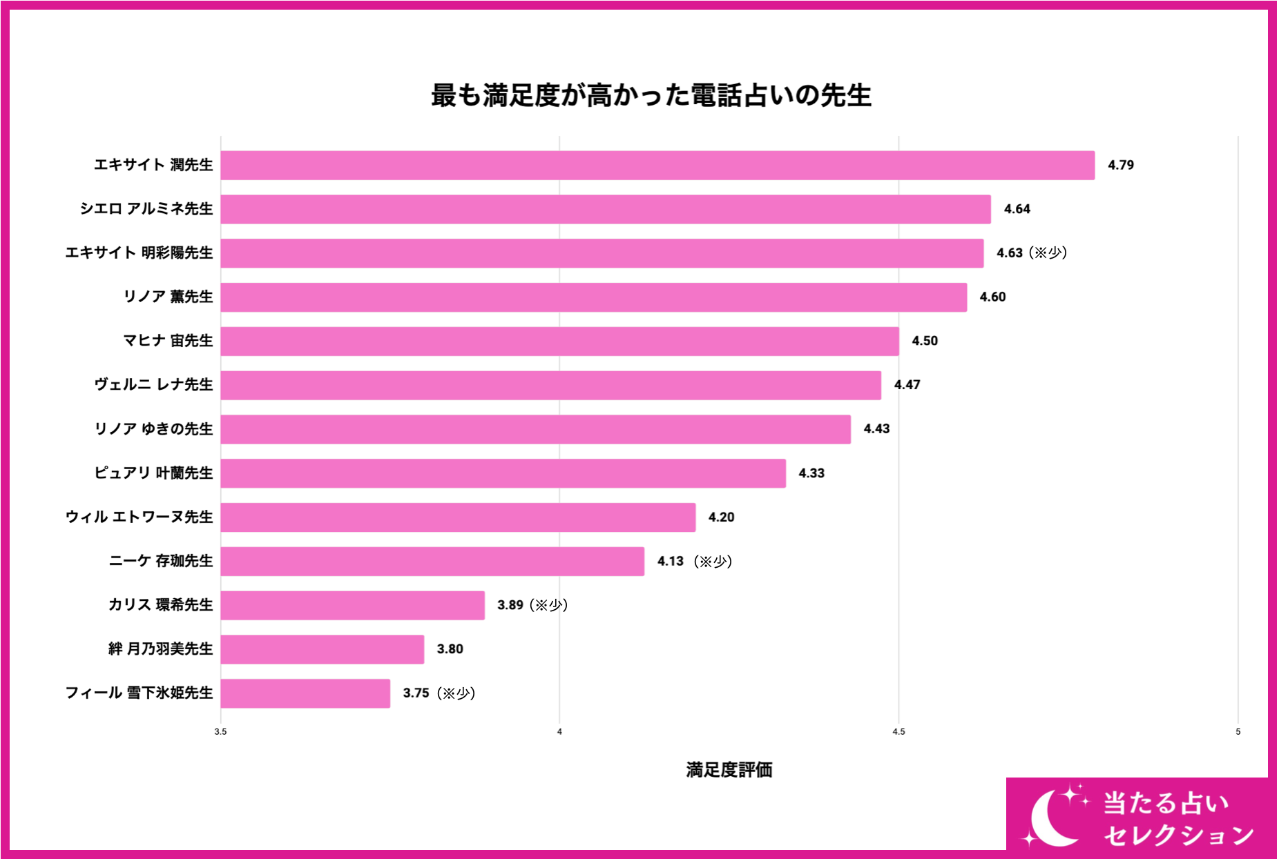 続いて、多くの電話占いの先生の中で最も満足度評価が高かったのはどの先生なのでしょうか?結論から言うと、画像の通り「エキサイト 潤先生」が満足度評価「4.79/5.00」で最も評価が高いことが分かりました。エキサイト潤先生は色々な記事や占いサイトでも特集が組まれているほど人気の先生のため、評価もばらつきやすいと思っている方もいるかもしれません。