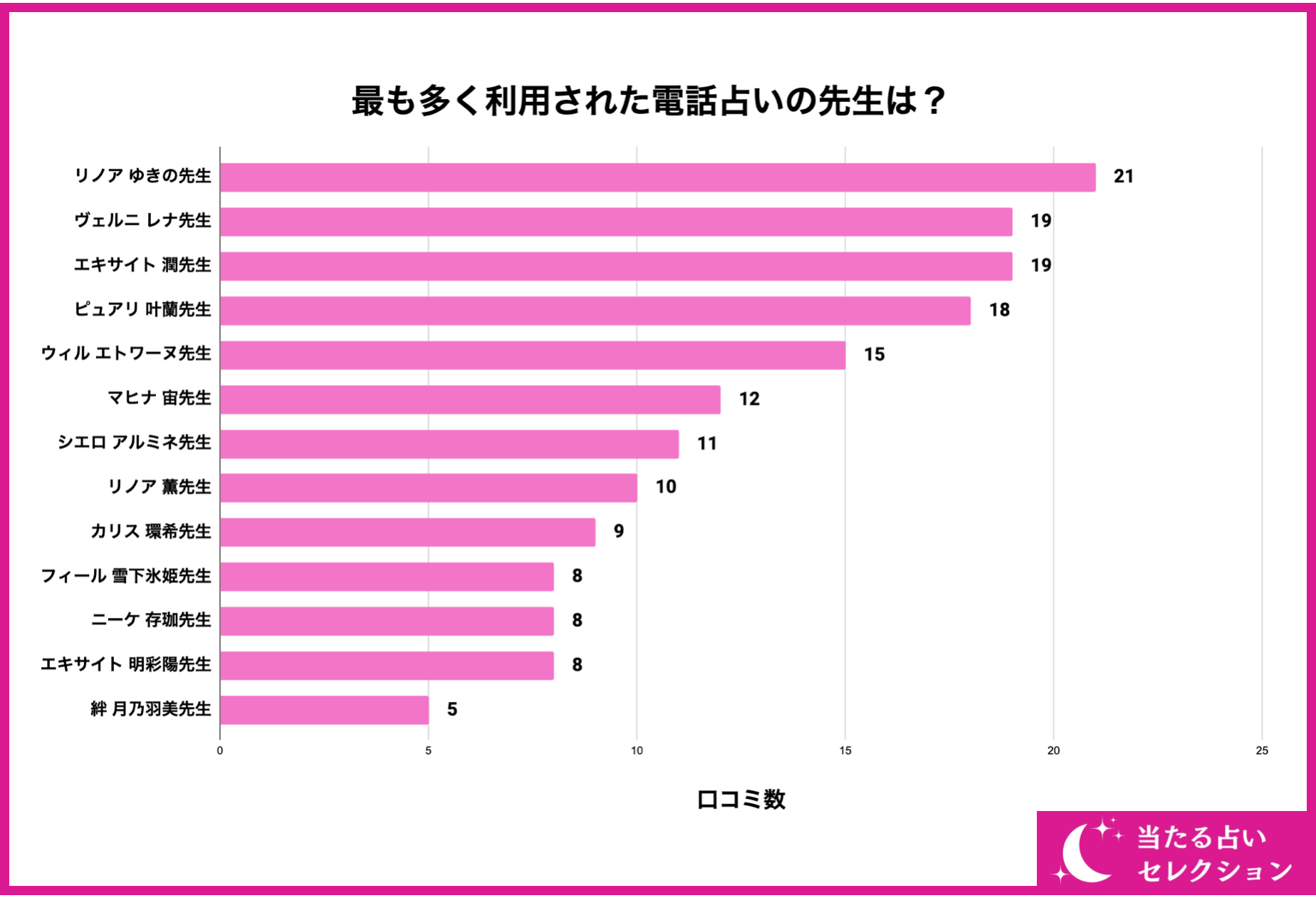 続いて、163名の利用者のうち最も多く利用された電話占いの先生をご紹介していきます。結論から言うと、『リノア ゆきの先生』や『ヴェルニ レナ先生』、『エキサイト 潤先生』といった有名な先生が上位となりました。やはり人気の先生は色々な記事や特集で見ることも多く、認知度や知名度が高いため、利用者数も多くなっています。