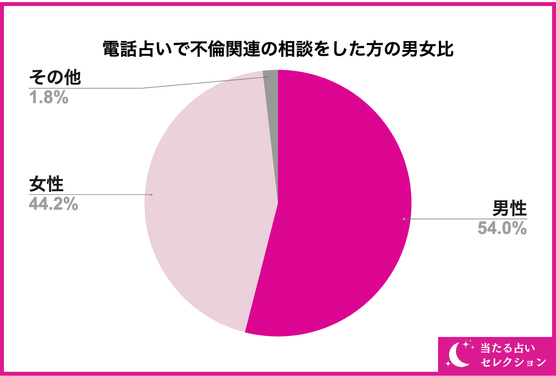 まず初めに、電話占いで不倫関連を相談する方の男女比についてご紹介していきます。電話占いで不倫関連を相談する男女の比率は画像の通り、男性が約54%、女性が約44%の結果となりました。電話占いで不倫関連を相談する人は女性が大多数というイメージが多いかもしれませんが、約54%(半分)が男性という結果になりました。