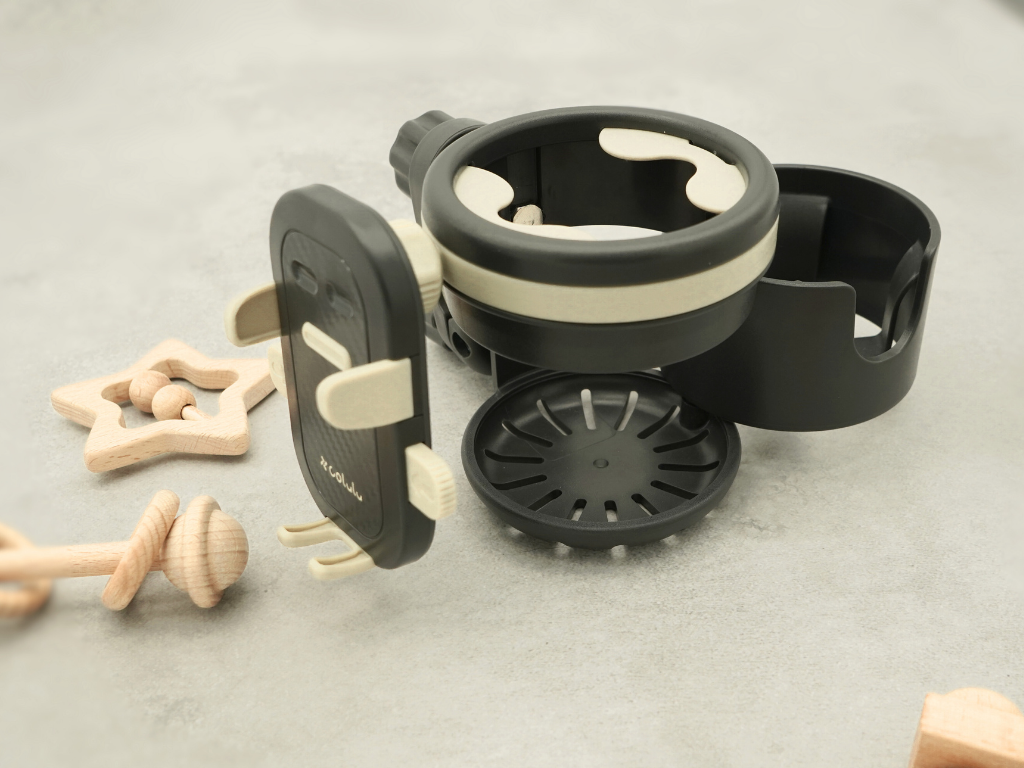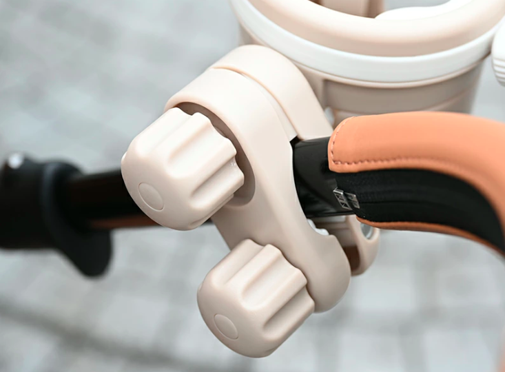 工具不要で簡単に取り付け可能なクランプを採用し、「すぐに使うものをサッと取り出したい」といった育児中の一般的な悩みをスマートに解決します。ホルダー部分は360度自由に角度調整ができ、使用者の動きや場所に合わせて柔軟に対応します。さらに、ダブルクランプでしっかりと固定し、ホルダー内側には滑り止めゴムが付いているため、走行中のベビーカーでも飲み物がこぼれる心配なく、安心してご使用いただけます。