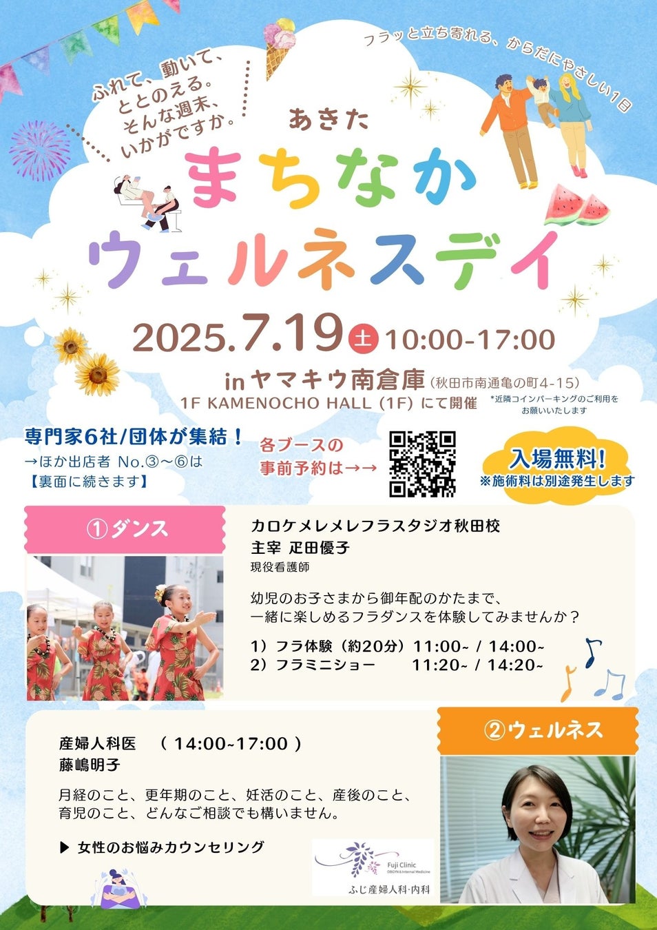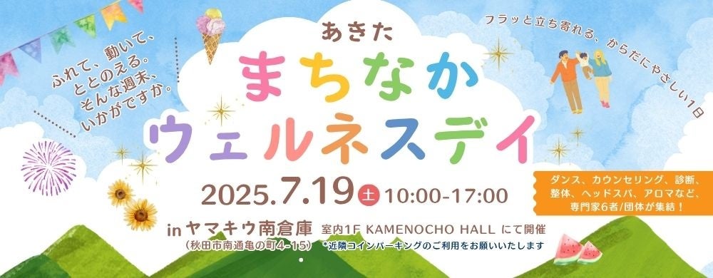 秋田市の中心部にて、地域の医療・福祉・ウェルネスの専門家が集い、予防・未病をテーマにした体験型イベント「まちなかウェルネスデイ」を2025年7月19日(土)に開催します。