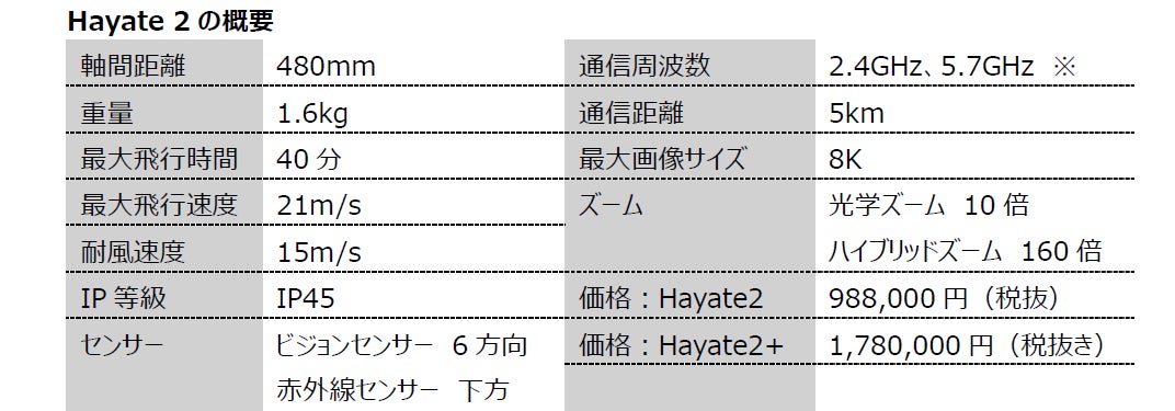 「Hayate2」は、インフラ点検、測量、行政機関での活用を想定して開発された国産ドローンで、優れた操作性・信頼性・安全性を兼ね備えたモデルです。このたび、生産体制およびソフトウェアの最終調整を経て、正式販売に至りました。