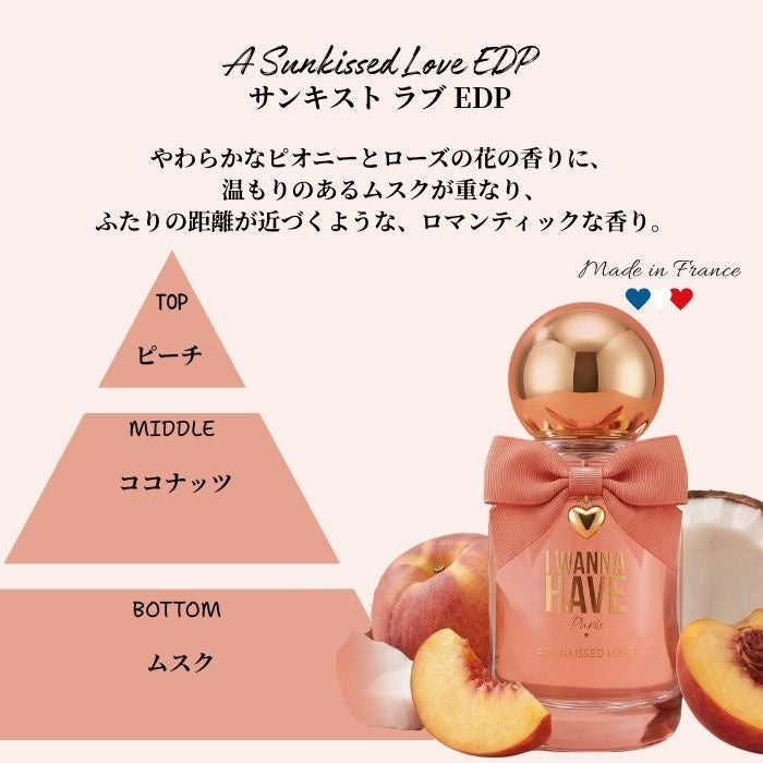 やわらかなピオニーとローズの花の香りに、温もりのあるムスクが重なり、ふたりの距離が近づくような、ロマンティックな香り。