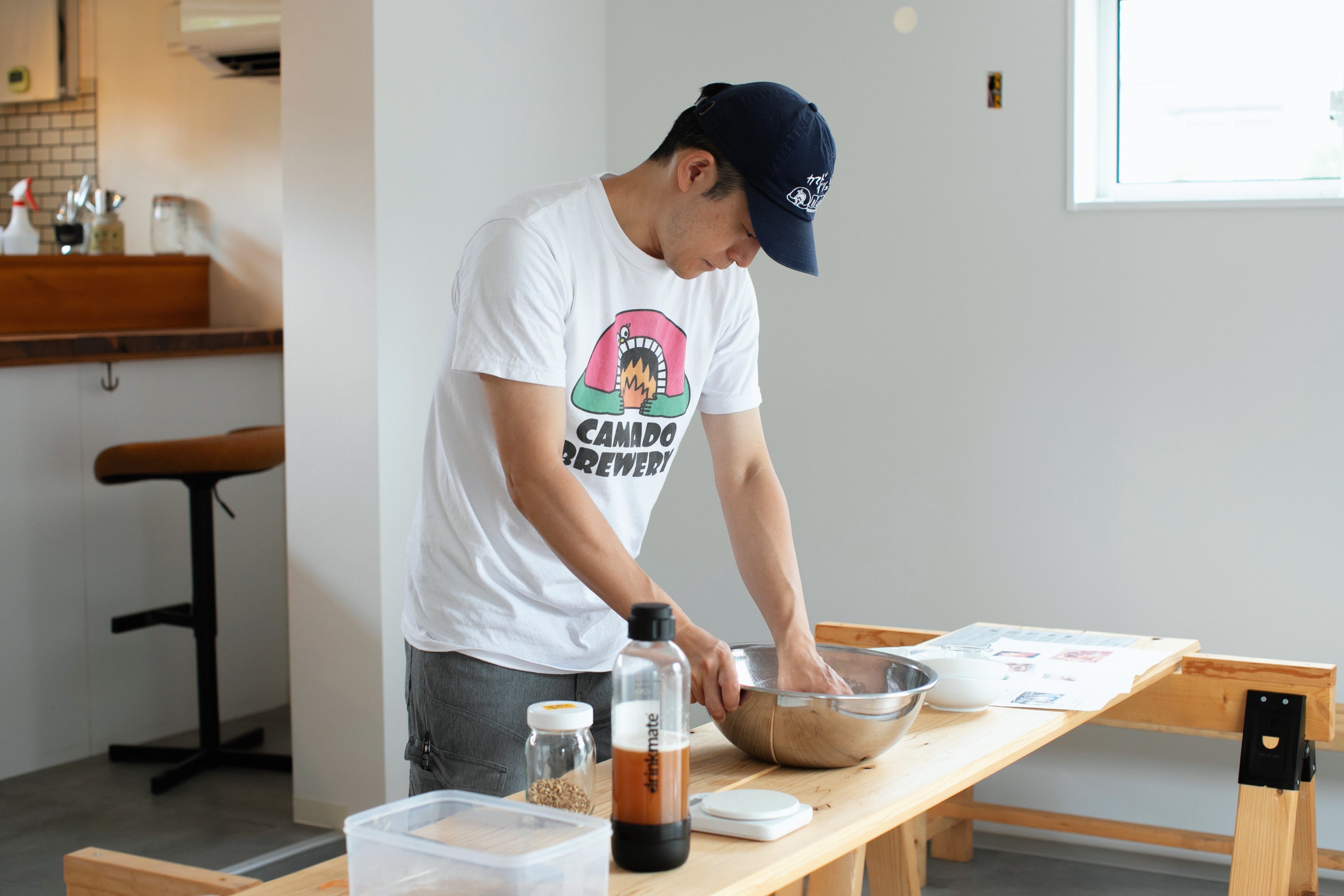 工場長を務める松阪鉄平は、パン作り一筋27年。過去には「カレーパングランプリ」で、金賞に輝いたこともある腕利きのパン職人です。 2024年、クラフトビール醸造とパン製作という2つの技術を磨こうと、醸造研修のためにカマドブリュワリーを訪れました。クラフトビール界のレジェンドと呼ばれる丹羽智の元でクラフトビール醸造を学び、パンとクラフトビールでの起業を模索。その後、2025年5月に釜戸町に移住して、クラフトビール醸造とパン作りにジョインしました。