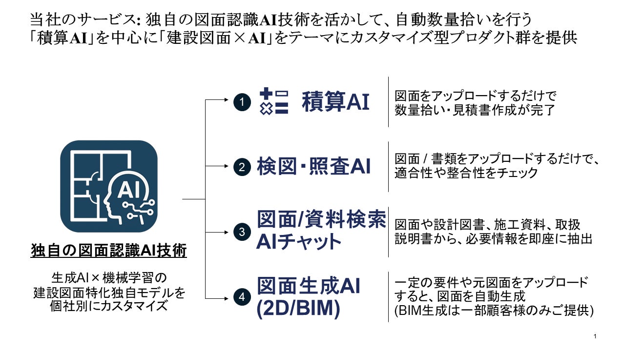 2024年11月、建設・製造業界の企業様向けに当社初となる3つの独自AIプロダクト「図面トレースAI/積算AI/照査AI」をリリースいたしました。(現在は図面トレースAIは積算AIの1機能としてご提供、照査AIは検図・照査AIに名称変更済)