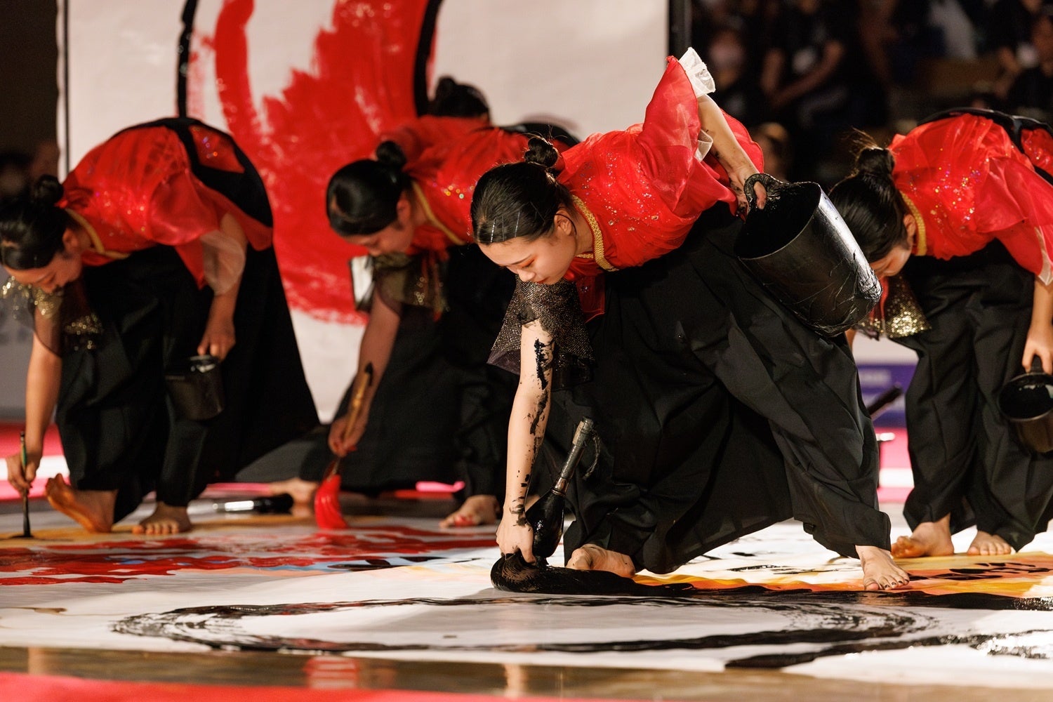 大会は、演技時間6分間の中で縦4m×横6mの巨大な用紙に向かい、音楽に合わせて様々なパフォーマンスをしながら自分たちの想いを揮毫します。書道パフォーマンスは、不断の努力とチームワークをもとに、書と演技の美しさを競う、まさに総合芸術です。