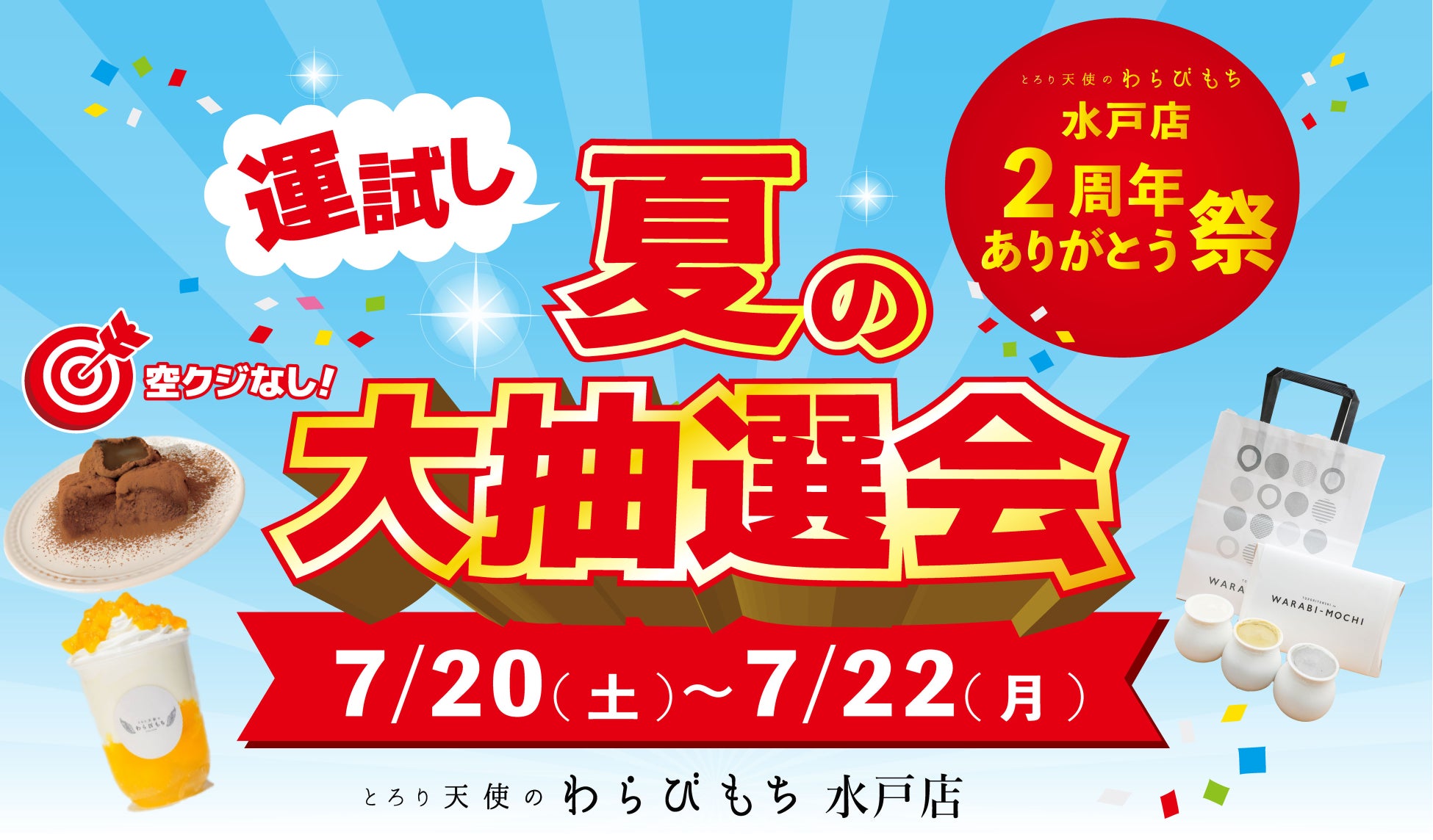 【2周年ありがとう祭開催】究極のとろとろ食感で話題の『とろり天使のわらびもち 水戸店』が7/20(土)〜7/22(月)の3日間2周年ありがとう際を開催!豪華特典が当たる大抽選会も実施!