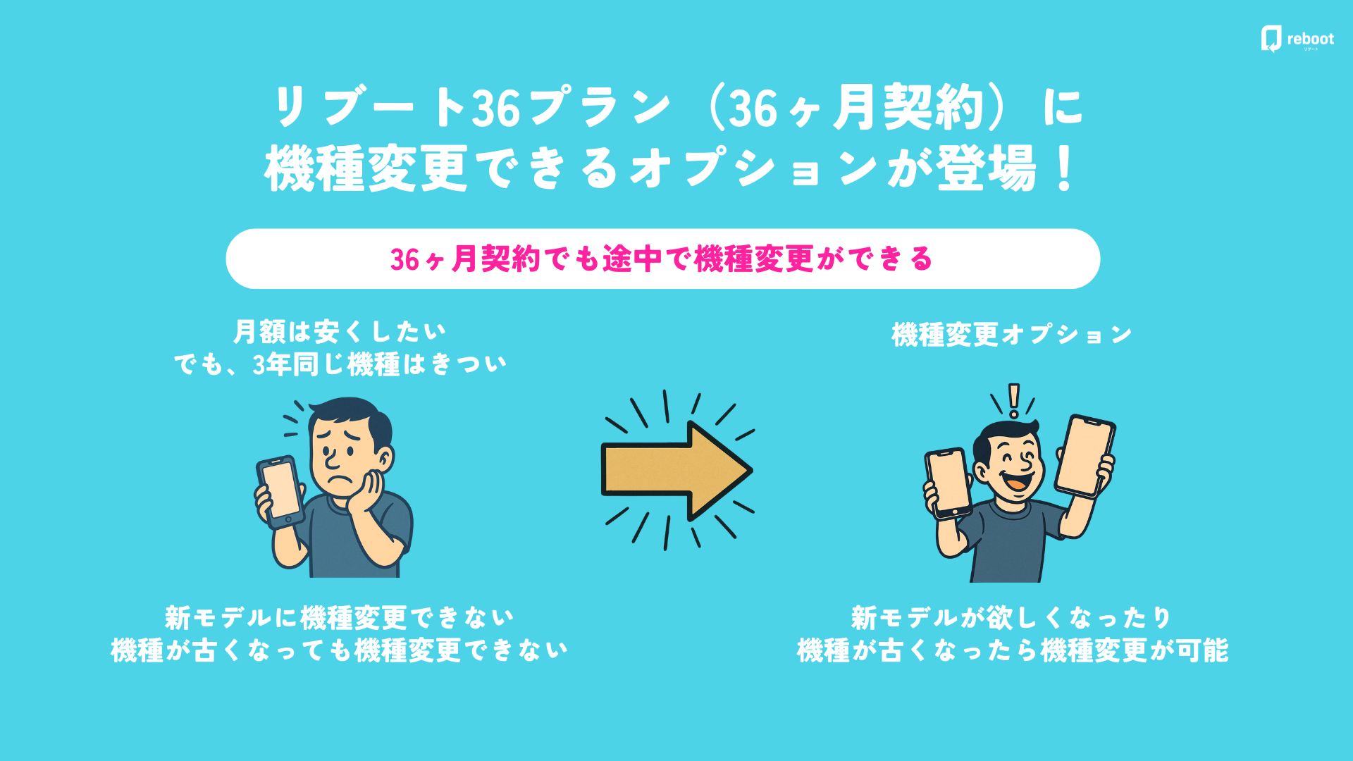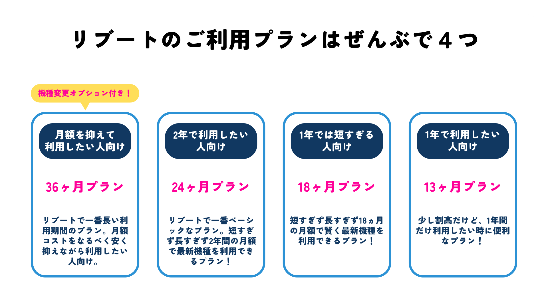 リブートは、従来の13ヶ月、18ヶ月、24ヶ月プランに加え、今回新たに提供を開始する「36ヶ月プラン」など、利用者の多様化するニーズに応じた選択肢を提供することで、より柔軟で快適なスマホ利用体験を提供してまいります。