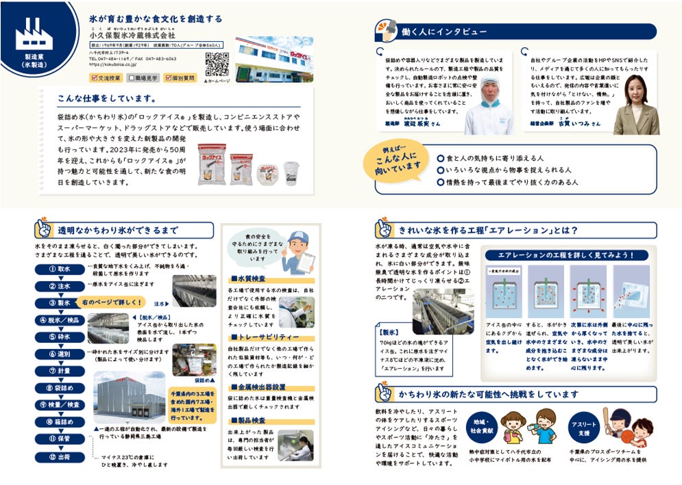 「発見たんけん千葉県」は、千葉県内の企業・団体協力の下、2021年から千葉県内の中学2年生向けのキャリア教育副教材として制作され、キャリア教育の一環として総合的な学習の時間で使用されることを想定しています。小久保製氷冷蔵は2023年度版より紙面掲載を実施し、子どもたちの職業観形成の応援を続けています。