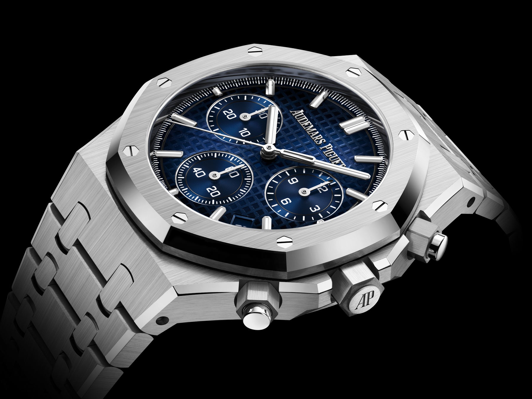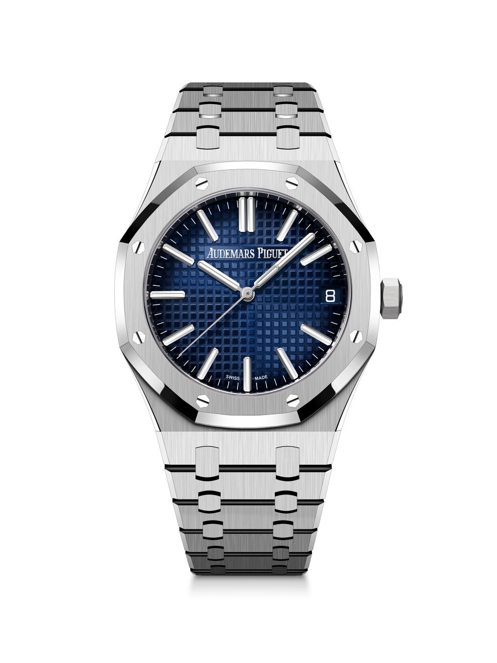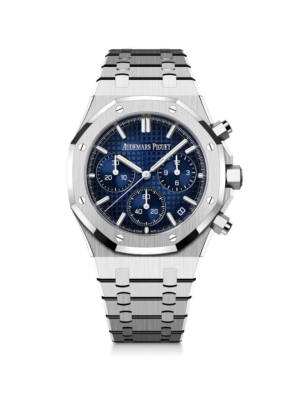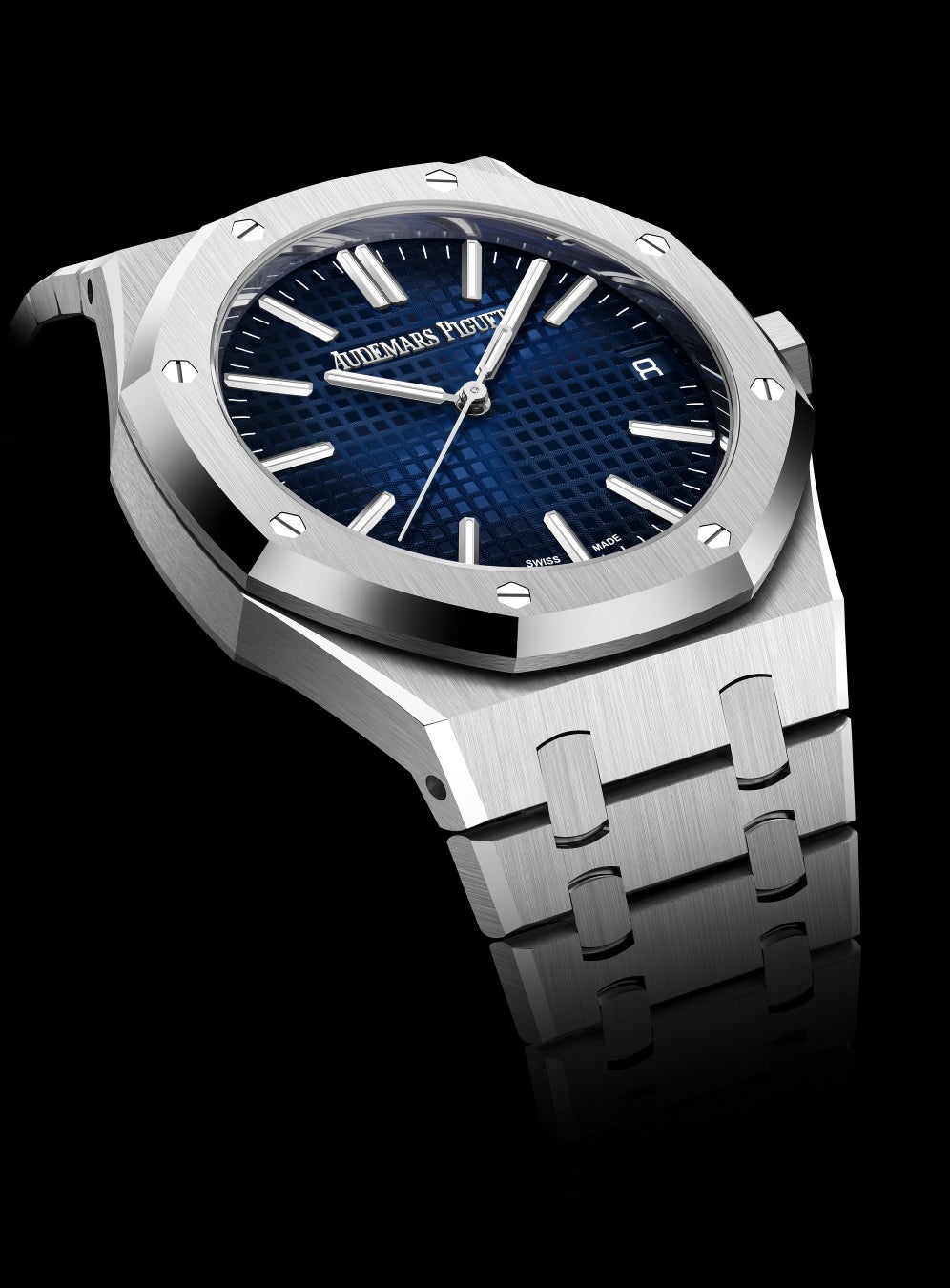 41mmの18Kホワイトゴールドケースの「ロイヤル オーク オートマティック」と「ロイヤル オーク クロノグラフ」は、スモークブルーの“グランドタペストリー”ダイヤルが特徴です。クロノグラフモデルは、スネイル仕上げを施した同系色のブルーカウンターが3時、6時、9時位置に配されています。2つのモデルは18Kホワイトゴールド製のアワーマーカーとロイヤル オーク針に施された暗闇での視認性を高める蓄光加工によって、ダイヤルの深みのある色合いと繊細なコントラストを演出します。