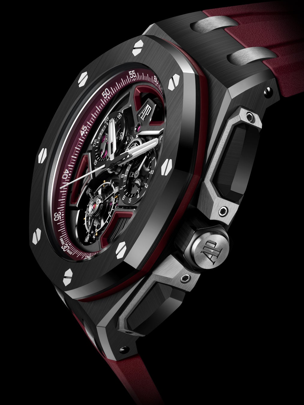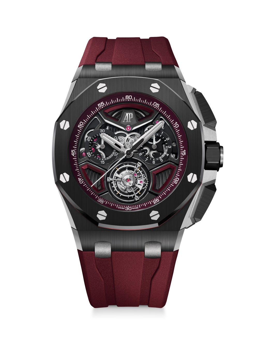 ブラックセラミックにチタンとバーガンディのディテールを施した「ロイヤル オーク オフショア フライング トゥールビヨン クロノグラフ」特別モデルは、43mmのブラックセラミックケースに収められた立体的なダイヤルでムーブメントが主役を飾るデザインが特徴。ブラックチタンのブリッジにはライン仕上げが施され、インナーベゼルにマッチするポリッシュ仕上げのバーガンディのインサートが加えられています。6時位置のフライング トゥールビヨンからは、自動巻きキャリバー2967をのぞくことができ、マルチファセットのケースは、存在感のあるエッジにポリッシュ仕上げが施され、ベゼルと反射防止加工サファイアクリスタルのわずかな縦のカーブにより、その立体的な構造が強調されています。