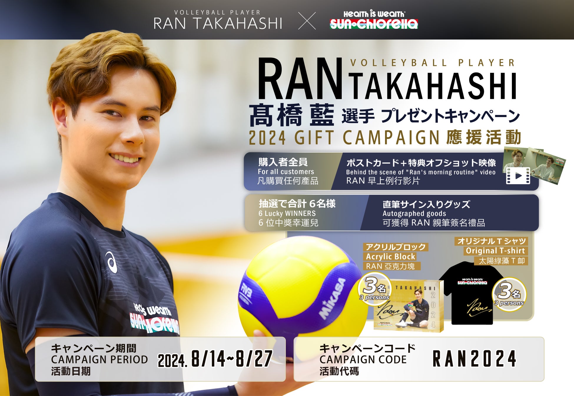 株式会社サン・クロレラ(本社:京都市下京区、代表取締役社長:中山 太、以下「サン・クロレラ」)は、2024年8月14日(水)からバレーボールプレイヤーの髙橋藍選手(所属:サントリーサンバーズ大阪)のモーニングルーティーン動画「Ran's morning routine」を公開いたします。また、動画の公開に合わせ2024年8月14日(水)~8月27日(火)の間、対象者全員へオフショット映像のQRコード付きポストカードのプレゼントや、抽選でサイン入りグッズが当たるキャンペーンを日本を含む世界8つの国と地域で実施します。8月15日(木)には髙橋選手とのインスタライブを実施予定です。