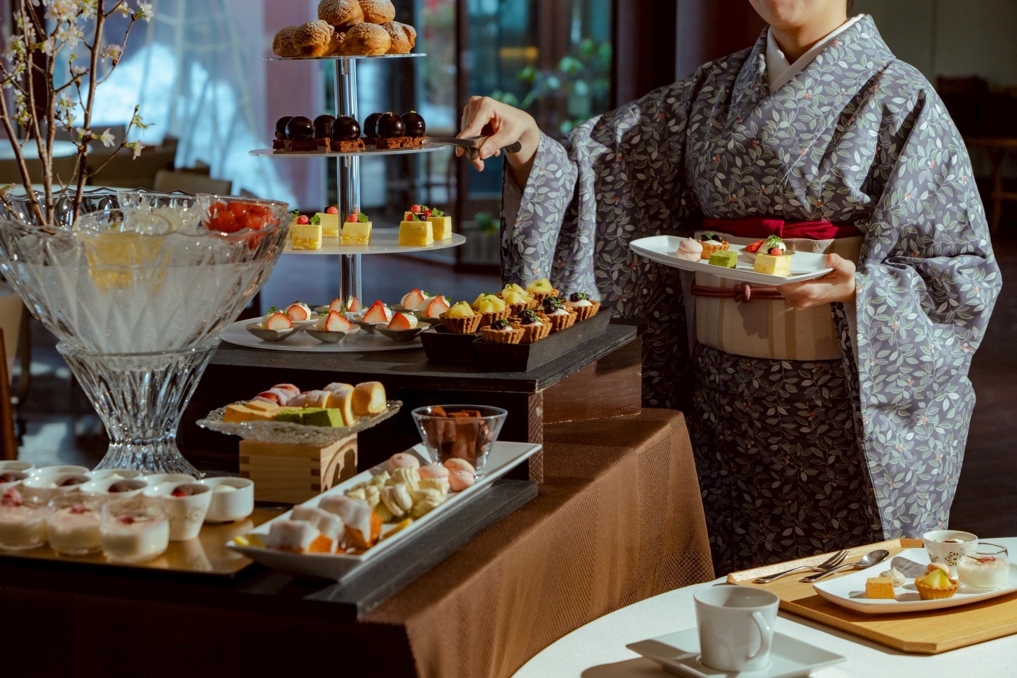 春の日差しが差し込む食事会場では、プロの奏者が季節の楽曲を琴で生演奏します。桜が咲く日本庭園の景観と、優雅な音色が日本ならではの「春」を演出します。