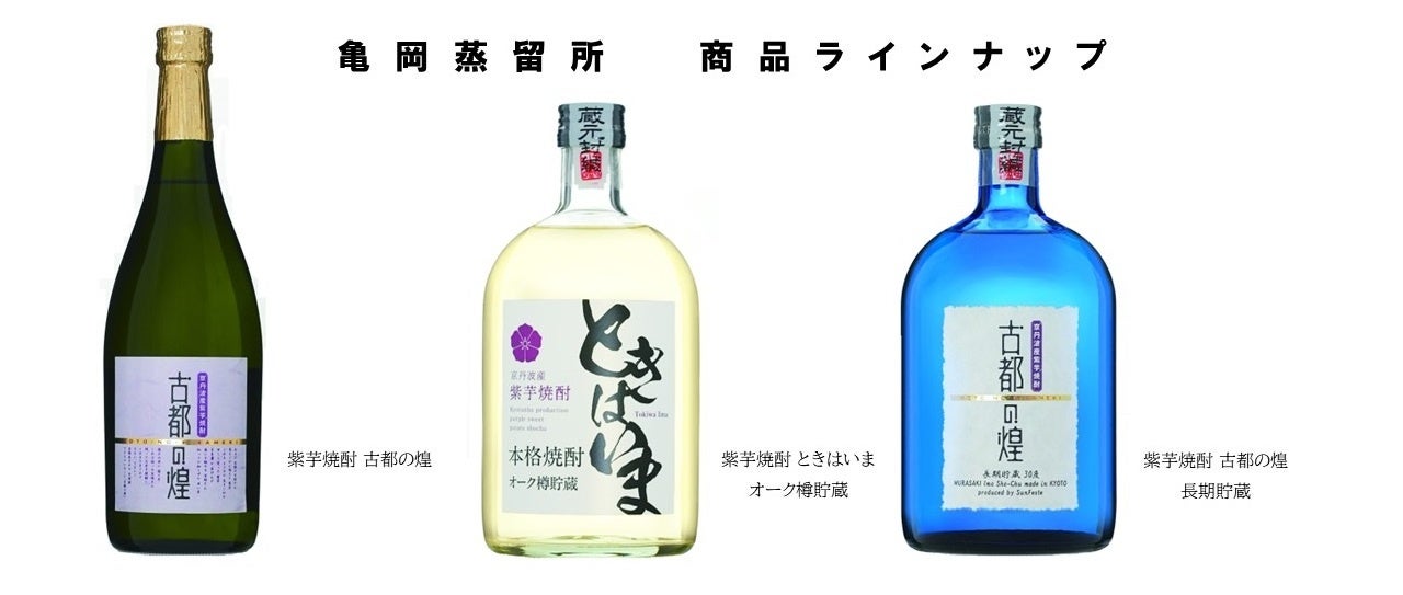 原酒の焼酎は、地元京都府亀岡市で契約栽培した紫芋「パープルスイートロード」を使用した「古都の煌」です。華やかな香りと上品な甘さが特徴の、非常に柔らかな紫芋焼酎です。