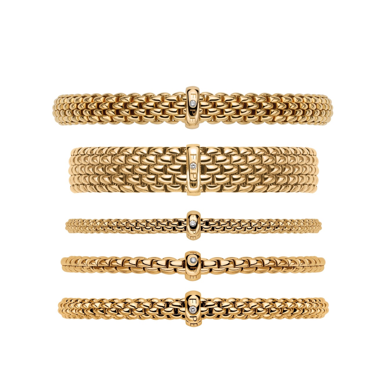 5 つのコアコレクション(エカ、プリマ、ソロ、ヴァンドーム、パノラマ)から発売された「MUSTHAVE(マストハブ)」。ブレスレットにセットされたロンデルには、FOPEの 「o(オー)」に1粒のダイヤモンド(ホワイトまたはブラック)がシンプルにセッティン グされています。 上からマストハブ“ヴァンドーム” 854,700円、マストハブ“パノラマ” 1,041,700円、マストハブ“プリマ”435,600円、マストハブ “エカ”442,200 円、マストハブ “ソロ”660,000 円(Mサイズ)※写真はすべてイエローゴールド
