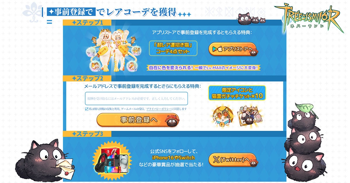 「ツリーオブセイヴァー:ネバーランド」はアジア11地域で同時に事前登録を開始しました。事前登録すると、限定のレア招き猫コスチューム特典がもらえます!さらに、限定称号や限定アイコン、Sonyのヘッドセット、新型Switchなどの豪華賞品が当たるチャンスもあります!