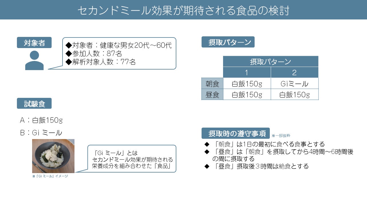 シュガコンでは、GI値に着目し、トータルバランスを考えた食事を提供するデリカテッセンを展開しています。そのノウハウをもとに、血糖値上昇抑制効果が期待される栄養成分を組み合わせた「食品」のセカンドミール効果について実験・検討しました。