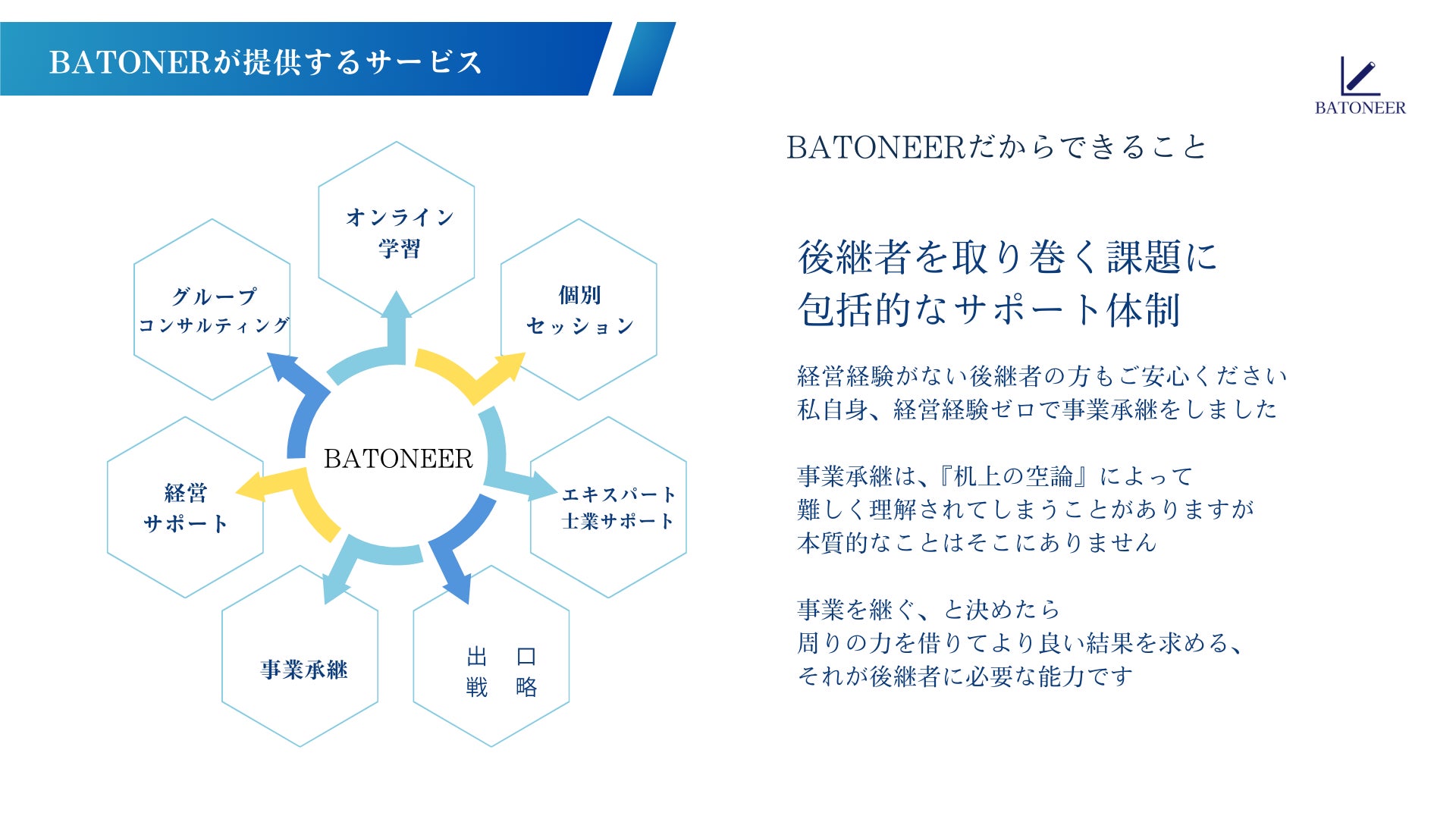 今回リリースされる『BATONEER』は、後継者に向けてオンラインでの経営知識学習だけでなく、伴走型経営コンサルティング、メンタルサポートといった後継者と事業を成長させるサービスです。また全国の事業承継に詳しい士業(弁護士、会計士、税理士、社労士、中小企業診断士)からの支援もあり、事業承継計画や継いだ会社を倒産から守るノウハウも揃っています。