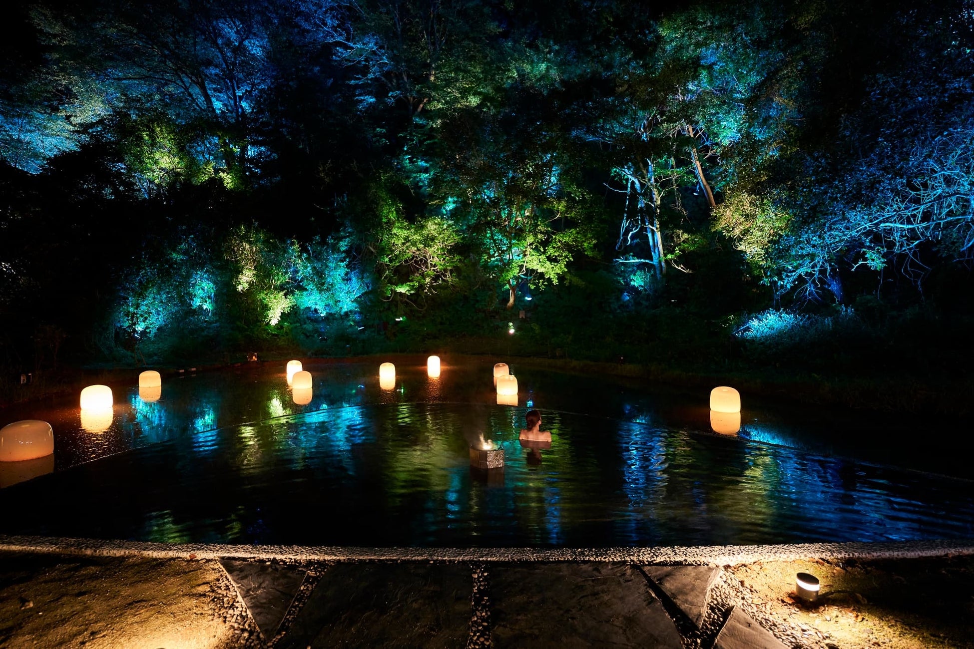 静けさに包まれた外湯から見える入浴者を包み込むように存在する木々、棚田跡に浮かぶランプ達は、水面に幻想的な情景を映し出します。