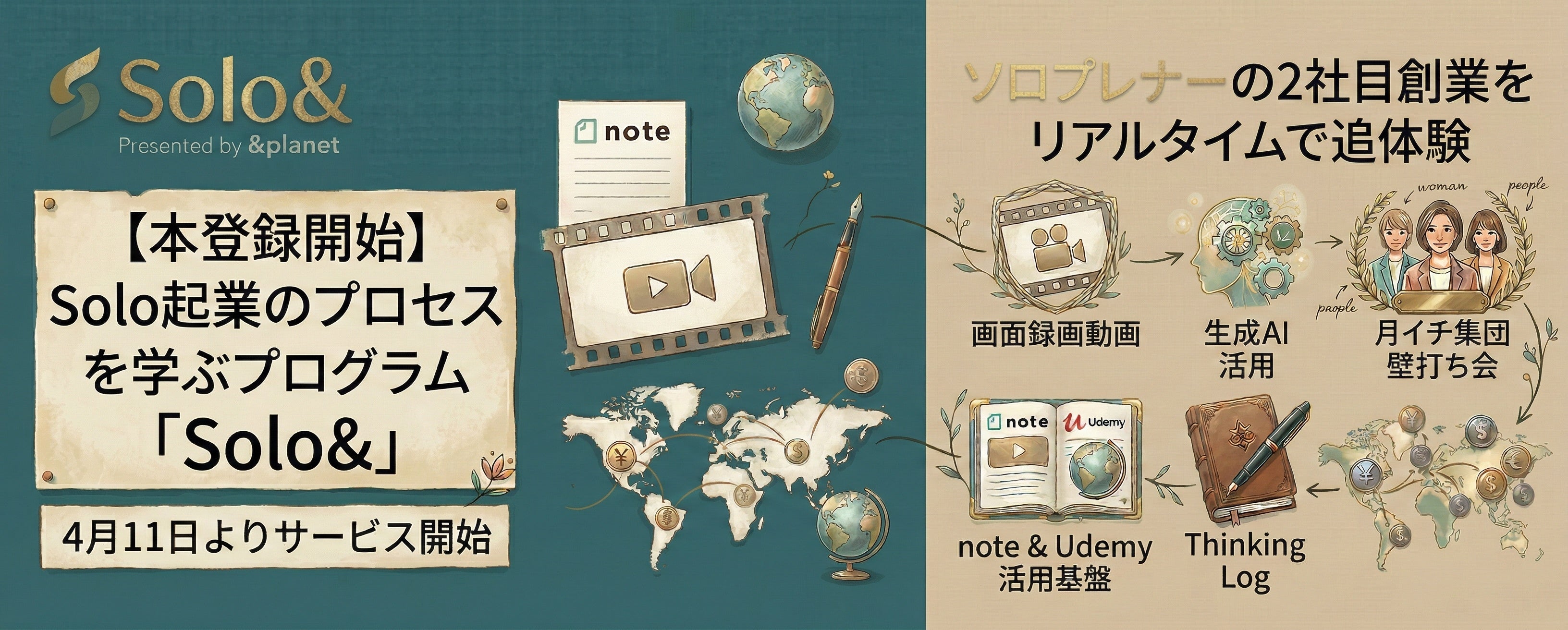 株式会社アンドプラネット(本社:東京都渋谷区、代表取締役:勝木健太)は、ソロ起業のプロセスを学ぶプログラム「Solo &(ソロ・アンド)」の本サービスを2026年4月11日より開始いたします。本日より会員登録の受付を開始します。Solo &は、事業売却を経験した起業家が2社目の創業過程を画面録画でリアルタイムに公開し、ソロ起業に必要なプロセスを追体験できる実践型のプログラムです。