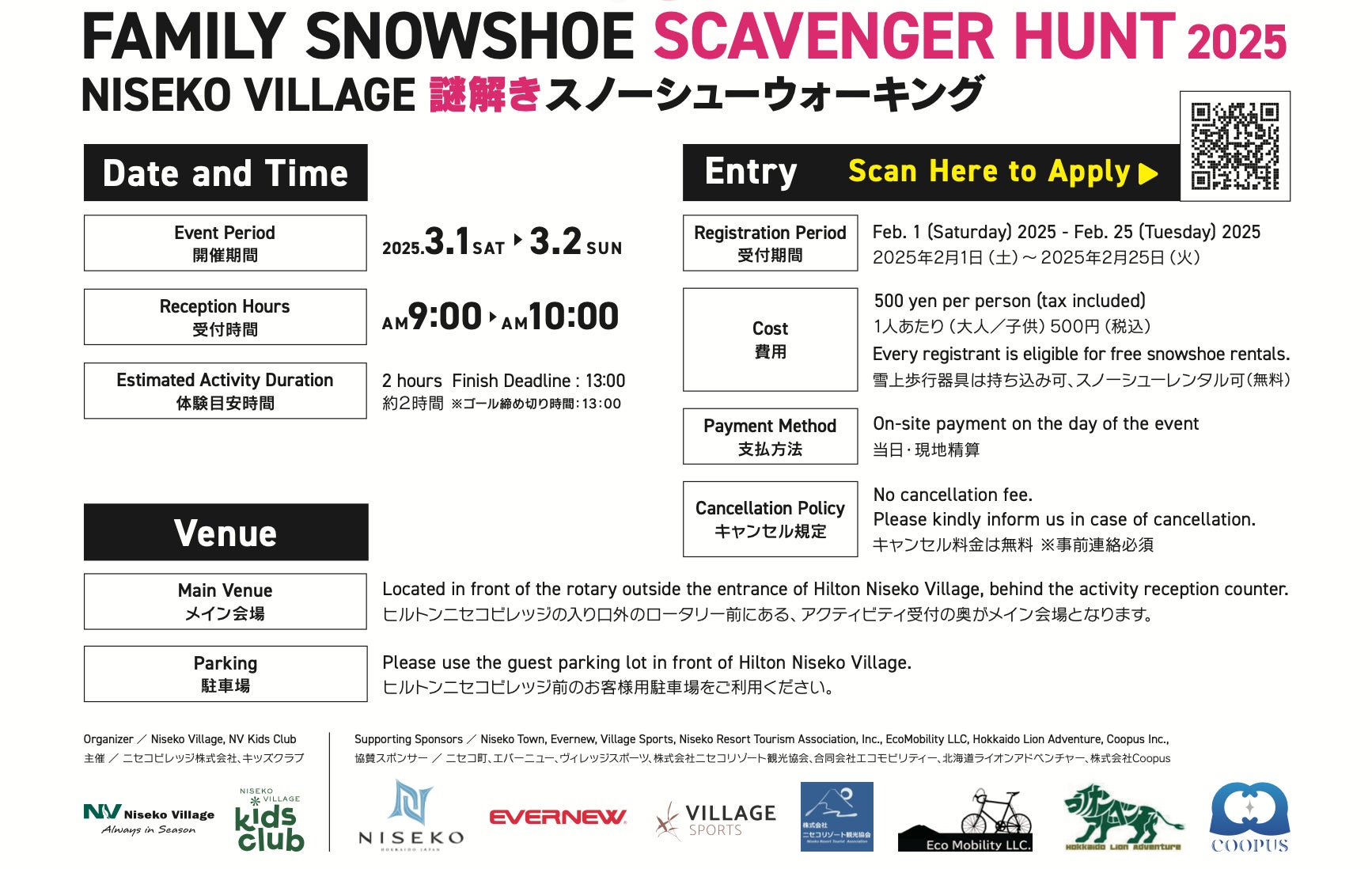 スポンサー新規募集!|ニセコビレッジ謎解きスノーシューウォーキング/ Niseko Village Family Snowshoe Scavenger Hunt イベント