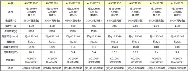 幅[150mm]と[120mm]タイプ、「電球色」と「昼白色」の2色、[人感センサー付き]と[人感センサー無し]のタイプからお選び頂けます。