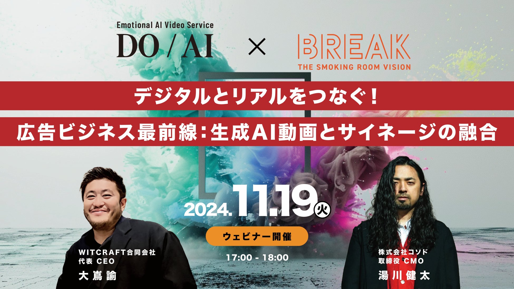 首都圏オフィスビル喫煙所サイネージメディア「BREAK」をニューステクノロジー社と共同で運営する株式会社コソド(本社:東京都千代田区、代表取締役CEO:山下悟郎)は、生成AIを活用した動画サービス「DO/AI(ドゥ・エーアイ)」を展開するWITCRAFT合同会社(本社:東京都品川区、代表CEO:大嶌諭)と共同で『デジタルとリアルをつなぐ!広告ビジネス最前線:生成AI動画とサイネージの融合』と題したオンライン無料セミナーを開催いたします。