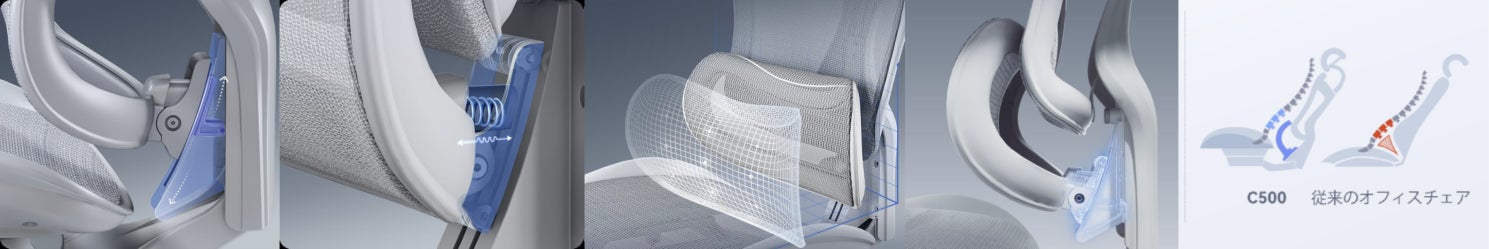 さらに、リクライニングの際に椅子と体のフィット感を向上させる技術を採用。腰の場所をより正確にサポートし、座面と背もたれのリクライニングに合わせて柔軟に可動することで、どんなリクライニング角度になっても的確に体の疲れやすい場所をサポートすることができます。