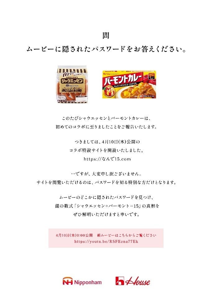 さらに、コラボムービーの公開と同時に、コラボ特設サイトがオープンします。特設サイトでは、謎の数式「シャウエッセン÷バーモント=15」の真相に辿り着くことができます。特設サイトの閲覧には、パスワードが必要です。ぜひ、コラボムービー内に隠された謎を解いて、特設サイトへお越しください。