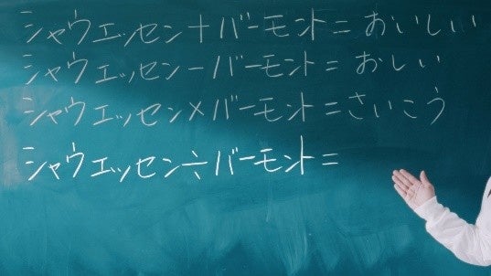 戸惑った表情で答える、生徒に扮する永尾さん。学校で算数の授業を受けている永尾さんが困惑していたのは、「シャウエッセン÷バーモント」という数式でした。先生の「いいか、シャウエッセン÷バーモントは…、15だ!」という説明に永尾さんの混乱はさらに深まります。