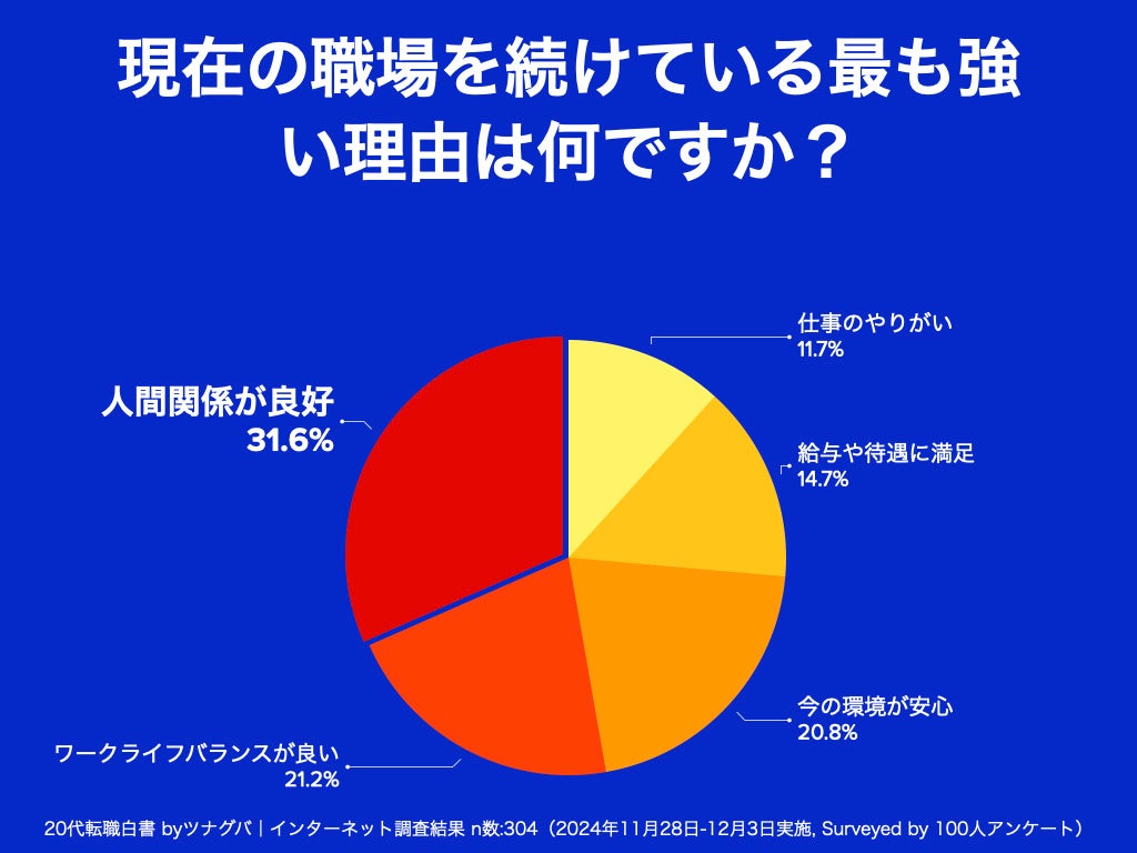 株式会社ツナグバのインターネット調査で、20代が転職をためらう最大の理由は「職場の人間関係」。給与不満を抱えつつも現職を選ぶ49%の心理とは?若手社員の定着要因に迫る「第6回20代転職白書」を公開!