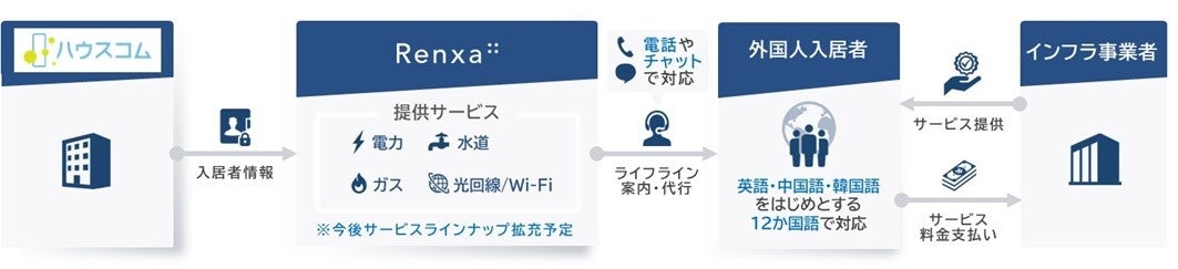Renxa株式会社(東京都豊島区 代表取締役:坂本幸司、以下「当社」)は、ハウスコム株式会社(東京都港区 代表取締役社長執行役員:田村 穂、以下「ハウスコム社」)と業務提携(以下「本提携」)を行い、海外から日本に移住される外国の方の新生活をサポートするため、生活環境やニーズに寄り添った最適なライフラインプランを母国語でご提案するサービス「Lifestyle Advisor Global」(ライフスタイルアドバイザーグローバル)(以下、「Lifestyle Advisor Global」)の提供を開始したことをお知らせいたします。