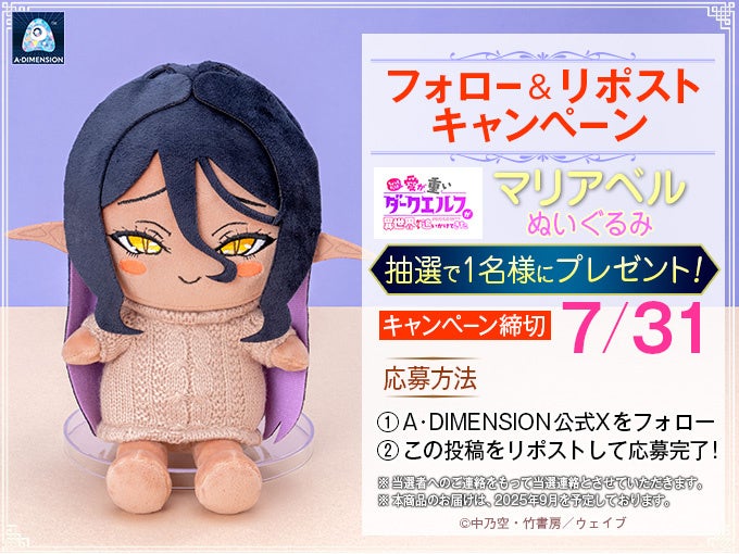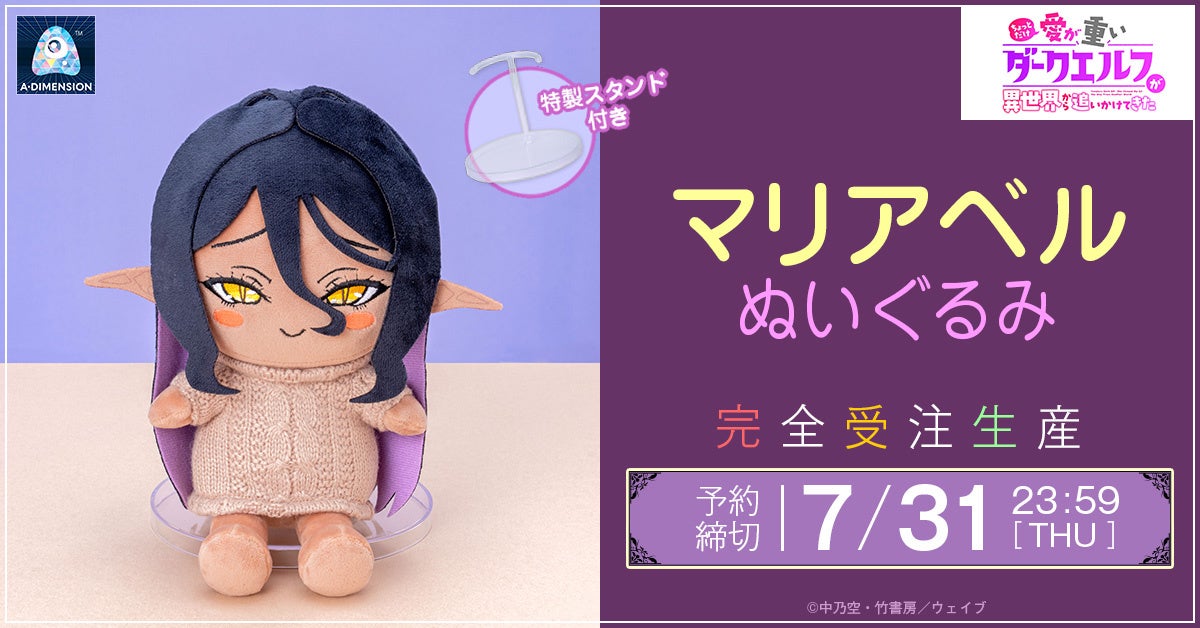 株式会社 A・DIMENSION(A ディメンション)(本社:東京都台東区、代表取締役社長:上村篤) は、TV アニメ『ちょっとだけ愛が重いダークエルフが異世界から追いかけてきた』より、「マリアベ ル ぬいぐるみ」「着せ替えアクリルスタンド マリアベル」「マリアベル 缶バッジ」の発売を決定し、 予約受付を 2025年5月22日(木)10:00より開始いたします。