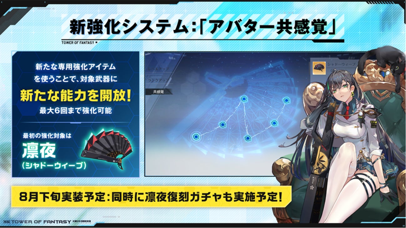 新強化システム「アバタ-共感覚」は8月下旬に実装予定です!新たな専用強化アイテムを使うことで対象の武器に新たな能力を解放可能、最大6回まで強化することができるようになります。
