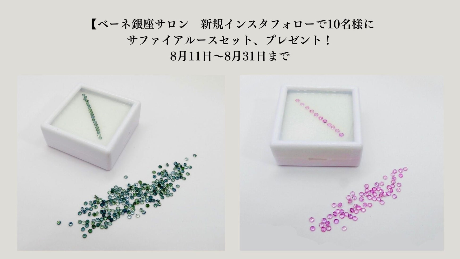 今回は、より多くの方々にベーネのルースクオリティを知っていただきたく、新規にインスタフォローしてくださった方、抽選で10名様にサファイアのメレサイズセットをプレゼント!