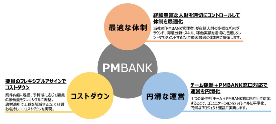 今回パートナー会員となる株式会社Tidesは、新たにプロジェクトマネージャー(以下、PM)経験者の人財供給サービス「PMBANK」を正式に開始しました。 この新サービスは、柔軟な勤務形態(リモートワークや時短勤務)を可能とし、年齢や性別に関係なく、現役からまだ実力はあるが早期にリタイアされたベテランまで年齢を問わず幅広いPM経験者のノウハウを企業に供給します。 課題となっているプロジェクトの取り纏めを担当するプロジェクトリーダーをPMBANKとして供給することで、今後増加が予想されるジョブ遂行パートナー向けの人財供給にも対応し、幅広いニーズに応えます。