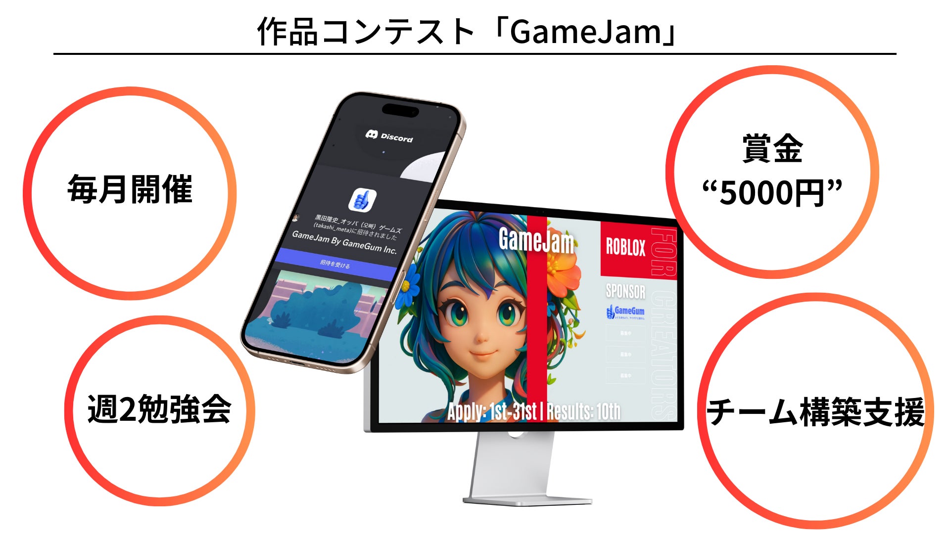クリエイターの挑戦を応援する新たな舞台「GameJam」始動!毎月開催Roblox作品コンテストで、クリエイターの創造性と技術を競い合おう。Discord週2回の勉強会、チーム構築支援を提供します。