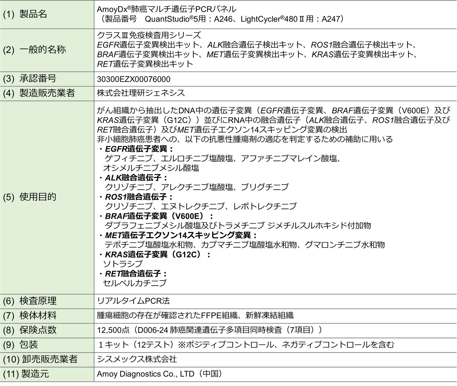 株式会社理研ジェネシス(本社:東京都品川区、代表取締役社長:岩壁賢治、以下「理研ジェネシス」)は、抗悪性腫瘍剤/チロシンキナーゼ阻害剤「ローブレナⓇ錠25mg及び同錠100mg」(一般名:ロルラチニブ、製造販売元:ファイザー株式会社)のALK融合遺伝子陽性の切除不能な進行・再発の非小細胞肺癌に対するコンパニオン診断薬※1として、体外診断用医薬品「AmoyDx®肺癌マルチ遺伝子PCRパネル」(以下「本製品」)の製造販売承認事項一部変更申請を厚生労働省に行いましたことをお知らせいたします。