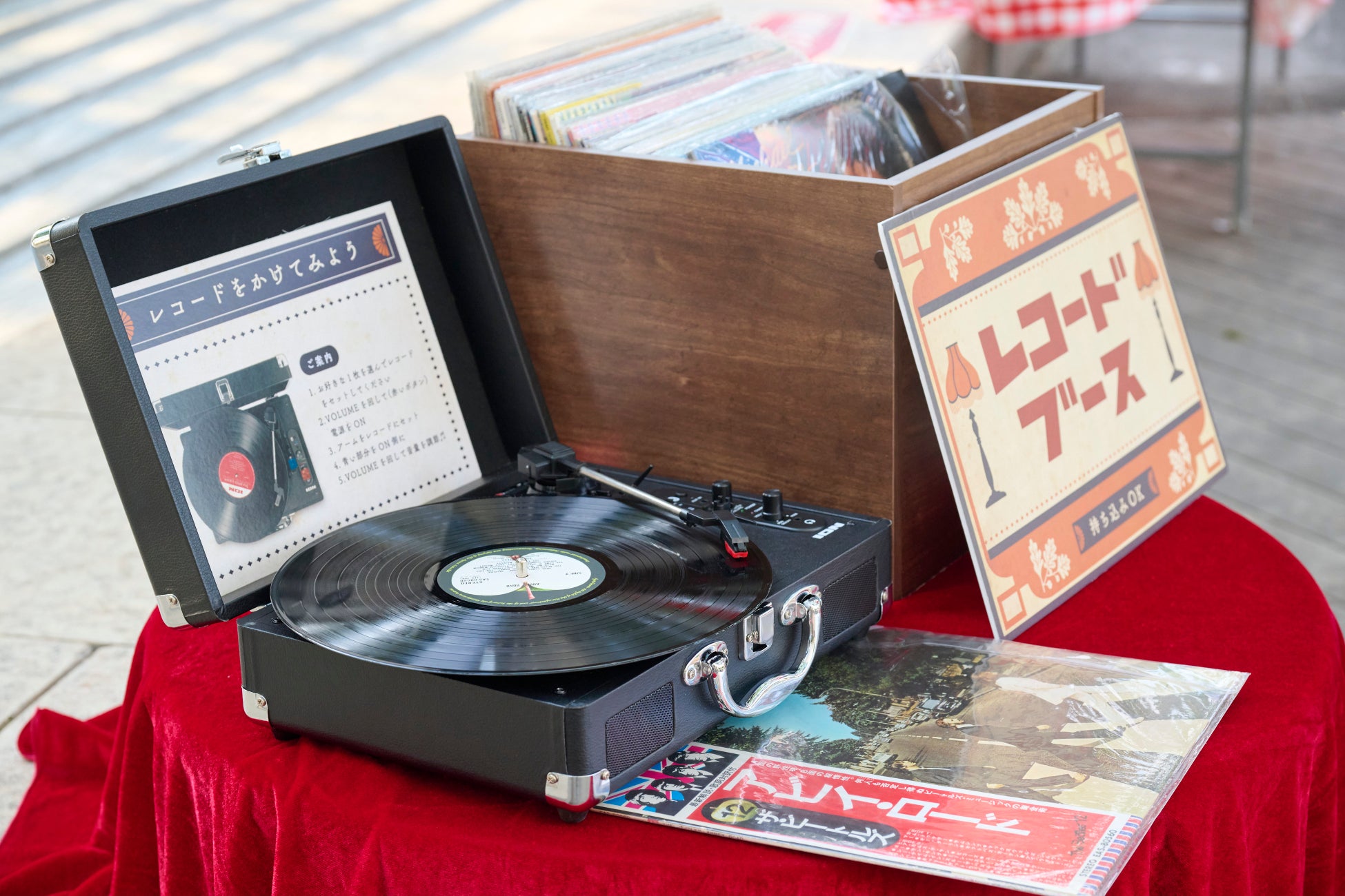 会場にはアナログレコードプレーヤーが登場。自宅から持参したレコードをかけるもよし、会場のレコードをかけるもよし。昭和のヒット曲や思い出のあの曲をレコードで楽しめます。