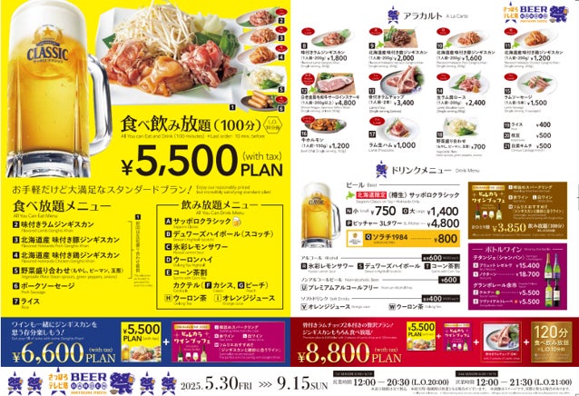 今年も、定番の味付きジンギスカンはもちろん、北海道産の豚・鶏ジンギスカンや、味付き鹿ジンギスカンに加え、今年の新メニューとして「骨付きラムチョップ」「生ラム肩ロース」などを取り揃え、何度来ても飽きずにご満足いただけるラインナップをご用意いたしました。また、サッポロクラシックをはじめとした、豊富なドリンクメニューもご用意しております。